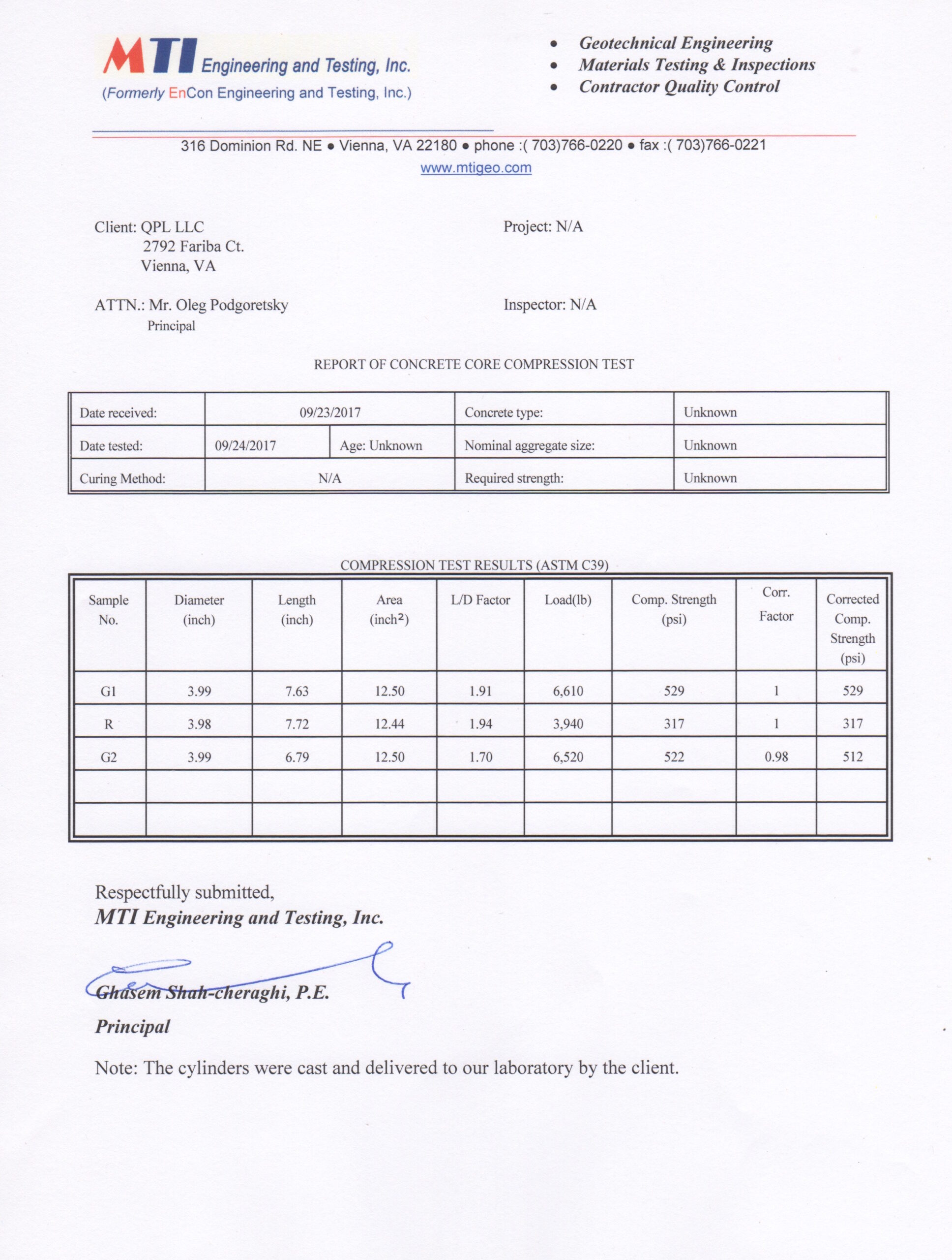 On September 17, 2017. Three concrete cylinder samples were prepared using a mix consisting of 65–70% High Strength “Sakrete” mix and 30–35% water.